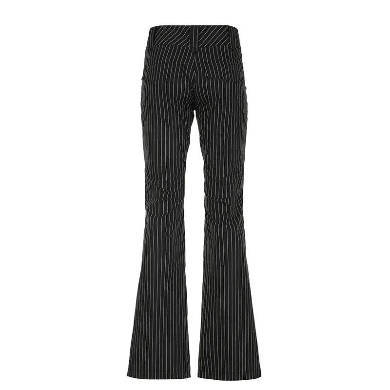 Elegantní rozšířené kalhoty s vintage nádechem a moderním stylem. Úzký střih s nízkým pasem a rozšířenou nohavicí je ideální jak do kanceláře, tak na neformální příležitosti. Klasický design a jemný rozparek dodávají každému outfitu sofistikovaný vzhled.