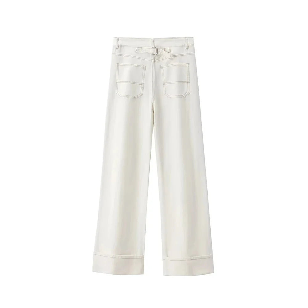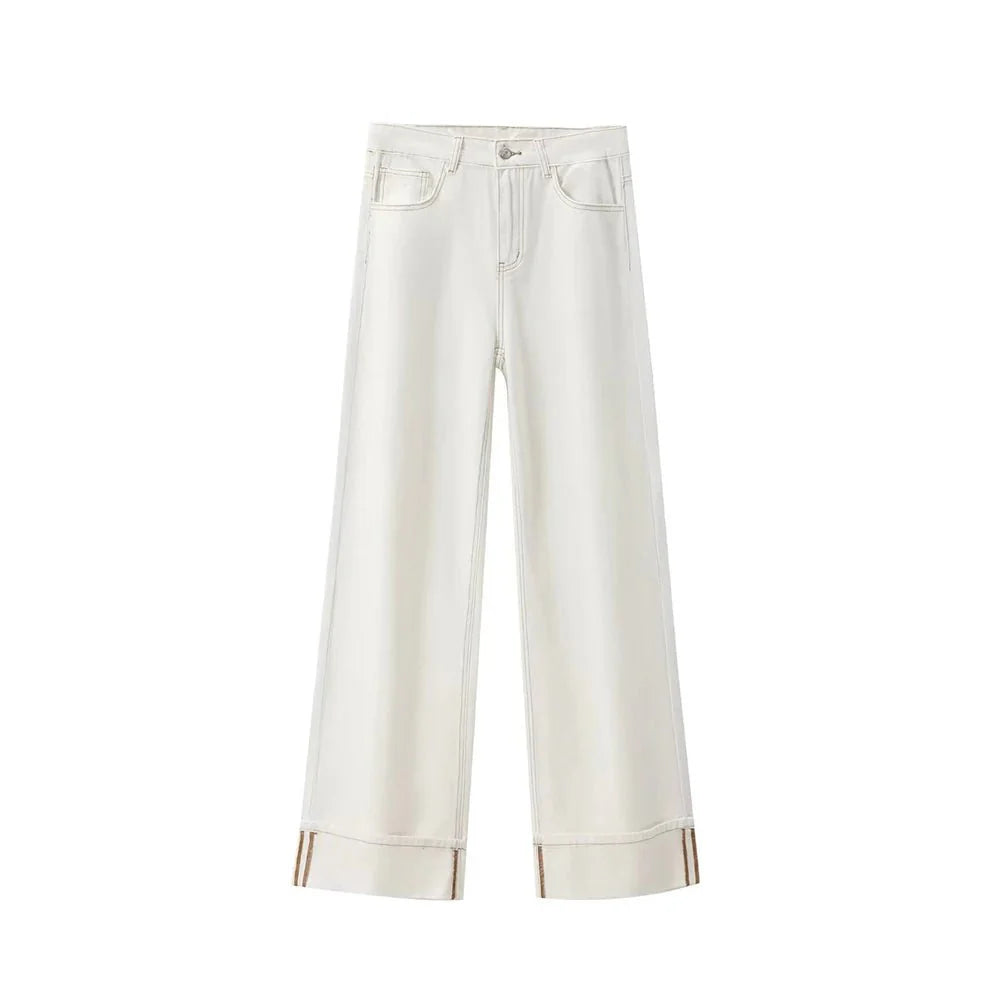 Bílé džíny s vysokým pasem a širokými nohavicemi. Klasický design s vintage vzhledem a ohrnutým lemem pro ležérní streetwear styl. Skvěle se hodí ke každému outfitu pro moderní, svěží vzhled.