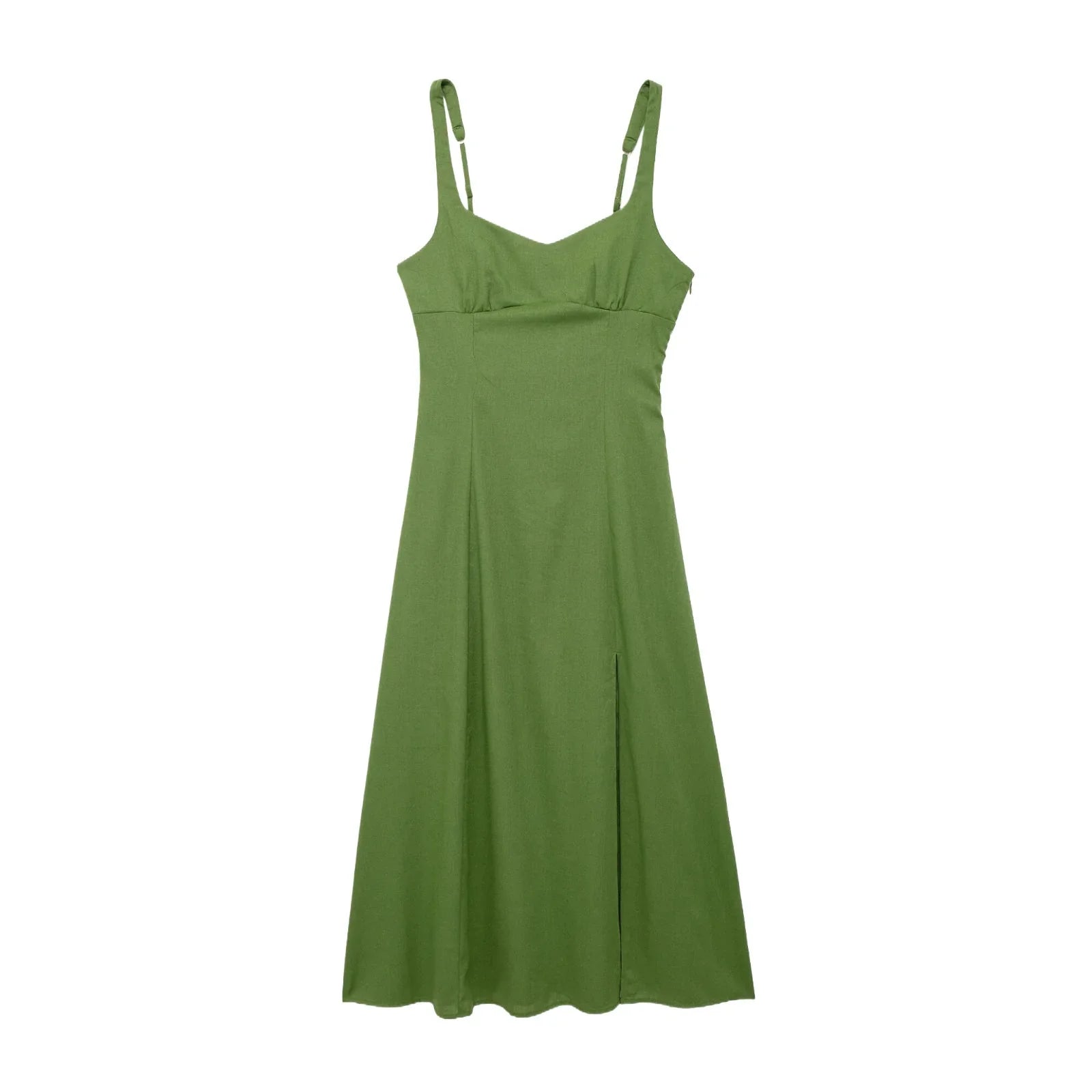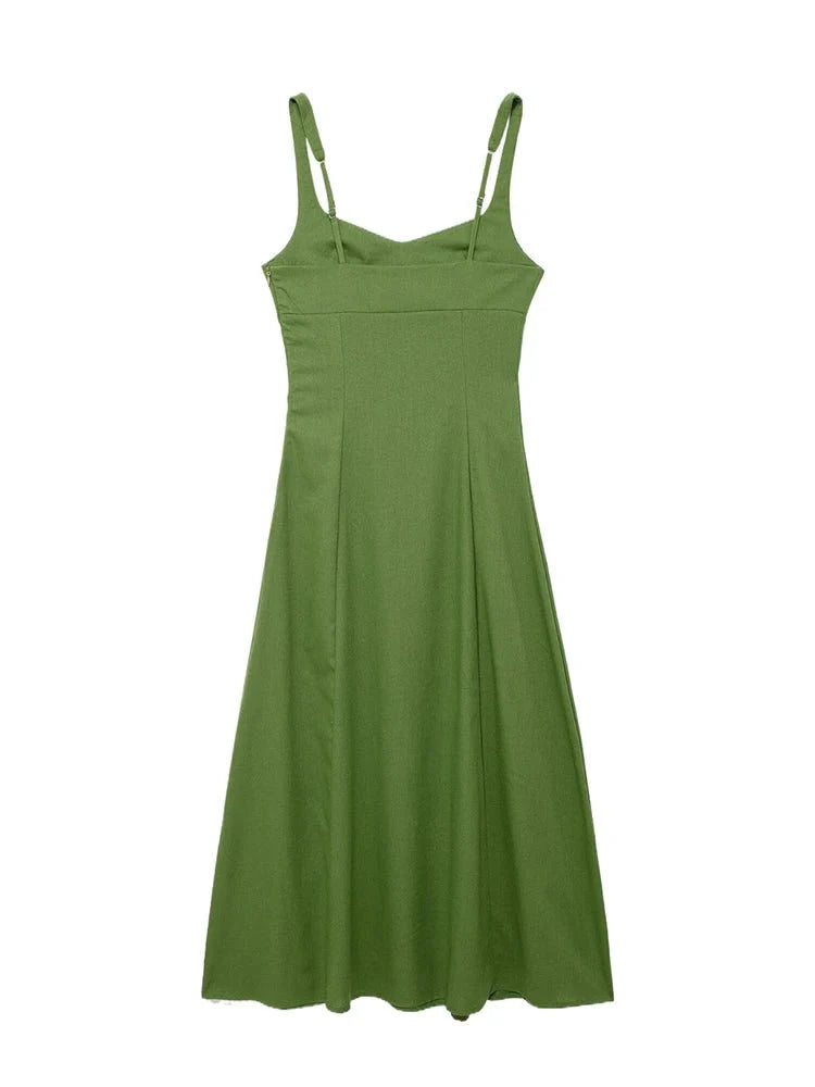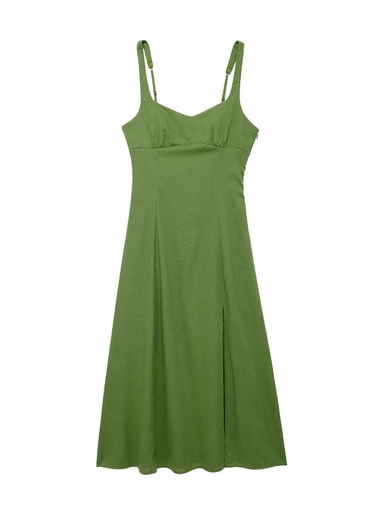 Univerzální letní šaty z lněného materiálu s nastavitelnými ramínky a stylovým rozparkem. Ideální pro teplé dny, ať už se chystáte na výlet nebo večer ven.